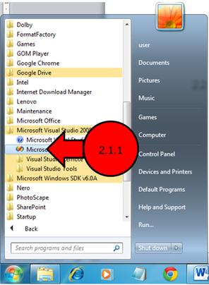 2.1.1 คลิกที่ Start button เลือก All Programs เลือก Microsoft Visual Studio 2008