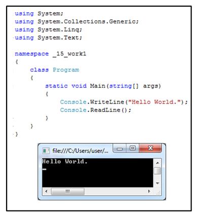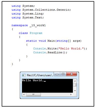 รูปที่ 1.8 คำสั่ง Console.Write และผลลัพธ์คำสั่ง Console.Write