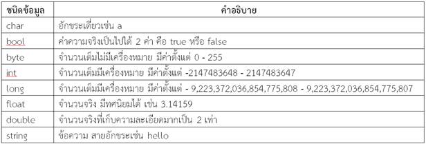 ตารางที่ 2.1 ชนิดข้อมูลหลักๆของภาษา C#